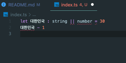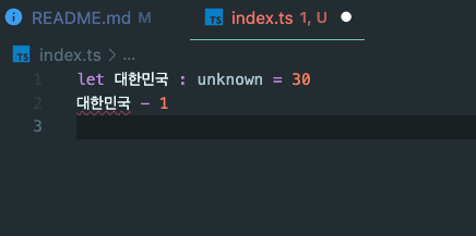 아래 사진처럼 unknown은 대한민국이 string이 아니기 때문에 오류를 표시하지만 any는 타입실드를 해제시켜 오류를 표시하지 않는다 일반 JS처럼 사용하고 싶다면 사용하는 것이 any다.