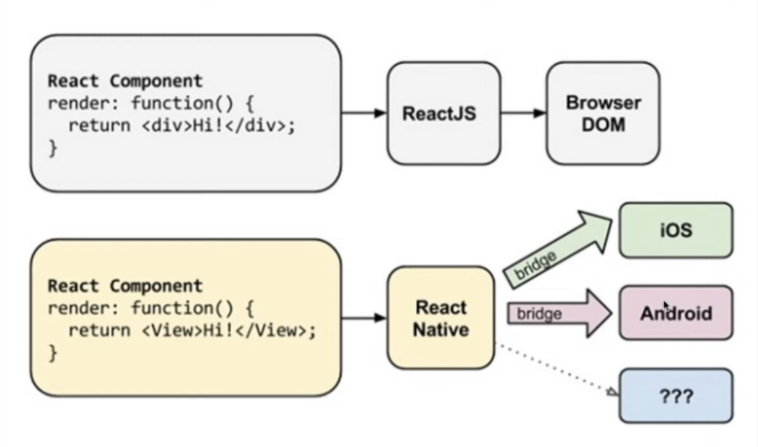 React Native가 ios에게 '버튼 그려달라고 한다. 또 안드로이드에게 버튼을 만든다.