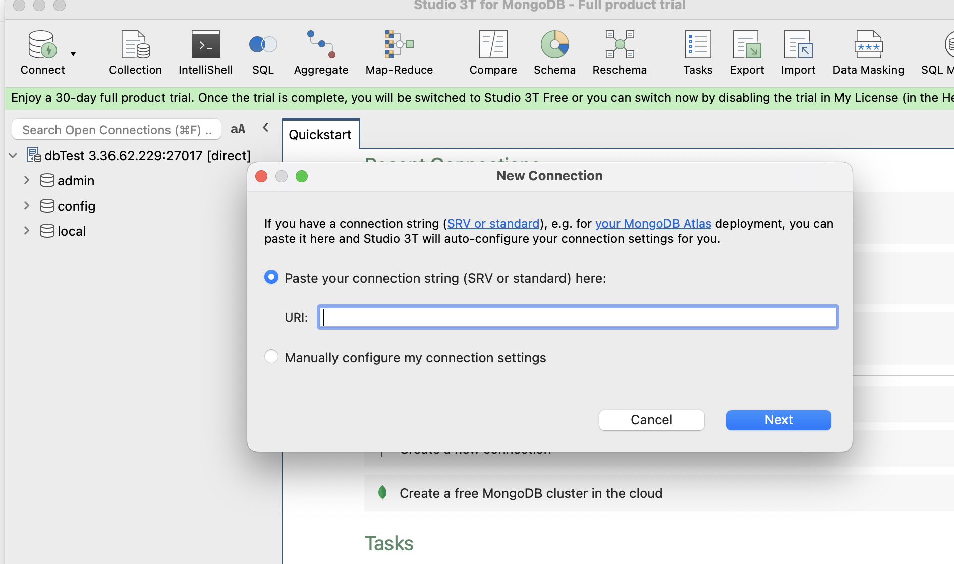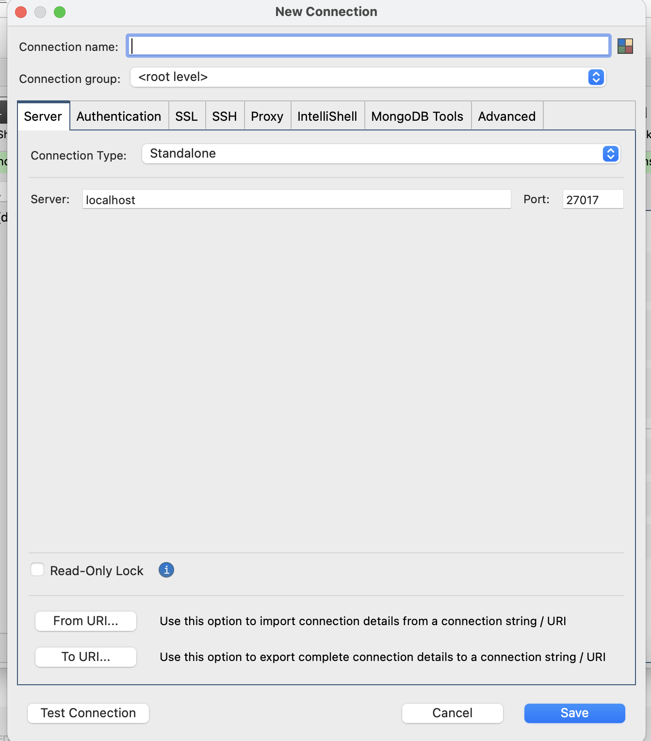 Authentication DB를 admin으로 설정해준 다음 왼쪽 하단에 있는 Test Connection을 누른 다음 Save를 눌러주면 올바른 Connect가 생긴다!