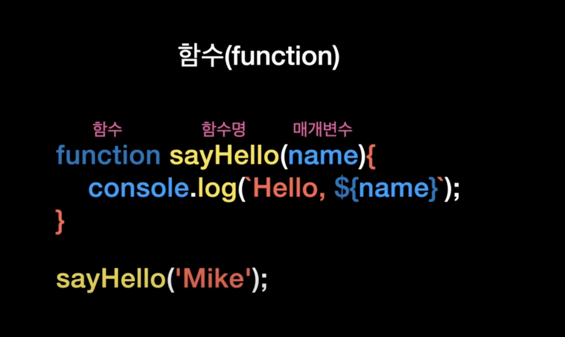 ※서비스를 만들다 보면 같거나 비슷한 동작들이 생기기 마련이죠? 팝업, 결재 등 이런 것들은 저장해서 재활용하는게 좋겠죠~ 함수는 이걸 가능하게 해주는데요 저희는 주로 console, alert, confirm을 씁니다! 그럼 다음 그림을 볼까요? 이 함수는 함수명 뒤에 괄호를 붙혀서 호출할 수 있습니다. 매개변수가 필요하다면 괄호 안에 넣어줍니다. ※ 함수의 매개변수(parameter)란 함수를 호출할 때 인수로 전달된 값을 함수 내부에서 사용할 수 있게 해주는 변수입니다. 또한, 함수의 인수(argument)란 함수가 호출될 때 함수로 값을 전달해주는 변수를 가리킵니다. 이렇게 들으면 이해되지 않을 수 있으니 매개변수가 있는 함수의 예를 들어 보자면 function sayHello(name){ con..